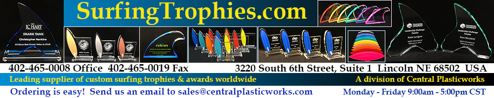 Thank you for visiting SurfingTrophies.com, a division of Central Plasticworks. If you are in charge of purchasing trophies for your event this year, we'll make you look good! We can create custom pieces for you to ensure that they are a perfect fit. ![]() ![]() Please click the pictures below to view each of our award galleries! If you don't see the perfect trophy or award in our galleries, please let us know. We have a full plastic fabrication facility and can create custom pieces for your event! We look forward to working with you! |
