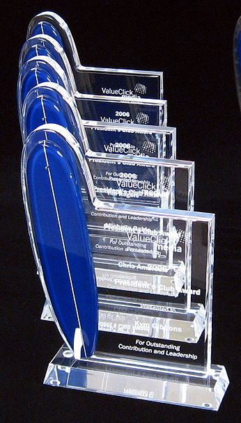The acrylic surfboard trophies pictured below are examples of our work. All pricing shown includes laser engraving of text/logos/images. A complete pricelist is at the bottom of the page. If you need something a little different, just let us know and we will do our best to accommodate your request.